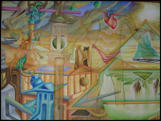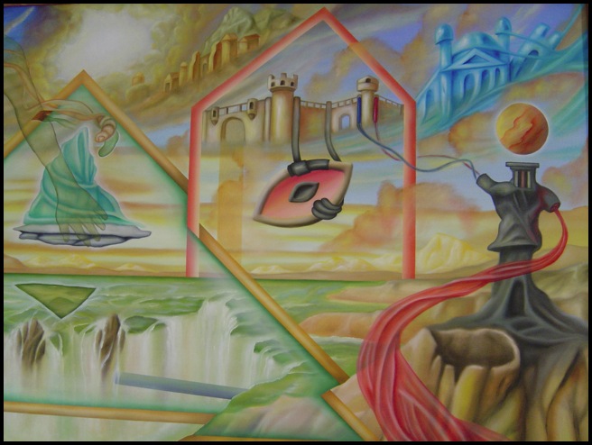 One of three in a series inspired by my children. Titled, Spatial Enlightenment; My Daughter Seattle’s Silhouette, for a few reasons. Firstly, because of the constant play on space and dimension; secondly, because I had my daughter Seattle in mind while painting this work, including her actual silhouette in the painting. This was my first all-out multiple layered, fields-of-color and subject matter painting, which continually evolved as the painting progressed. It was about being able to flood the canvas with tons of objectivity, and yet, assure the viewer that it is completely balanced, each object in perfect harmony with the next. This was also about a struggle for attention; that is, the gold triangle and teal colored object in the center of the painting do a great job of attracting the viewers attention, yet the hand from Seattle’s silhouette blocks this focal point, encouraging the viewer to look upon her.